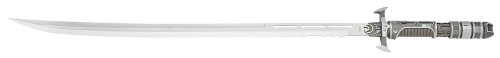 The Samurai of the year 3000 A.D. is a master of high technology fighting and weaponry and their primary arm is the plasmium sword, a device constructed by highly disciplined sword masters using an extremely secretive form of physics. The UC1258 & UC1259 feature the Samurai code of justice, service, and honor on the handguard, engraved in their secretive language. The handle is made of precisely machined parts. The scabbard locks to the handle and can only be released with a push of a hidden button. The blade is sharp, fully functional stainless steel. Available in 2 versions with black and silver blade. 36" overall. 26 1/16" blade.